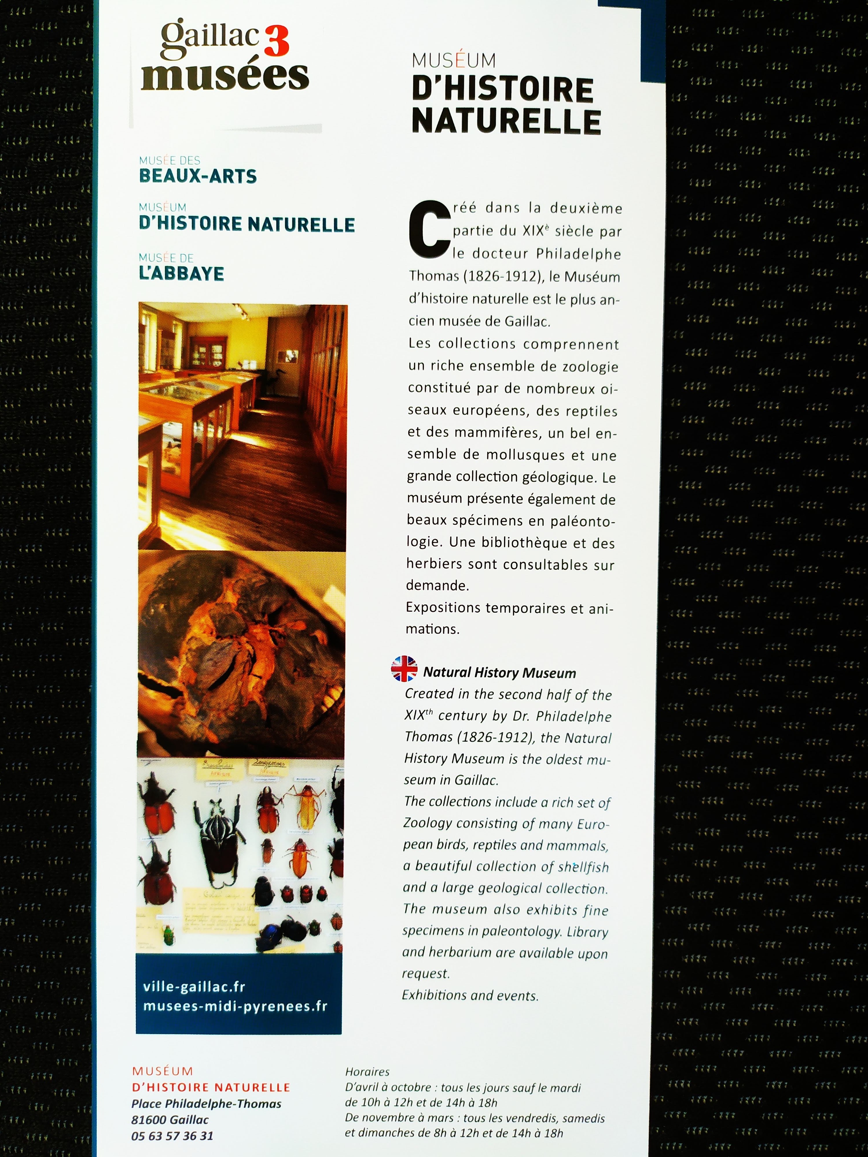 Voici toutes les informations sur le Musée d'histoire naturelle Musée d'Histoire Naturelle Philadelphe Thomas qui ce trouve au 6 Pl. Philadelphe Thomas, 81600 Gaillac (81). Sur cette fiche vous trouverez les photos, l'adresse, les horaires d'ouverture, le numero de téléphone et les avis clients.Vous pouvez églement rédiger un avis si vous le souhaitez en bas de page.